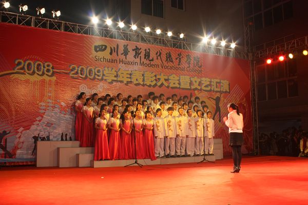 200911251830分,“四川华新现代职业学院2008——2009学年度表彰大会暨文艺汇演”在露天广场隆重举行。热闹的舞台、火红的鲜花、高扬的音乐,让人为之振奋。