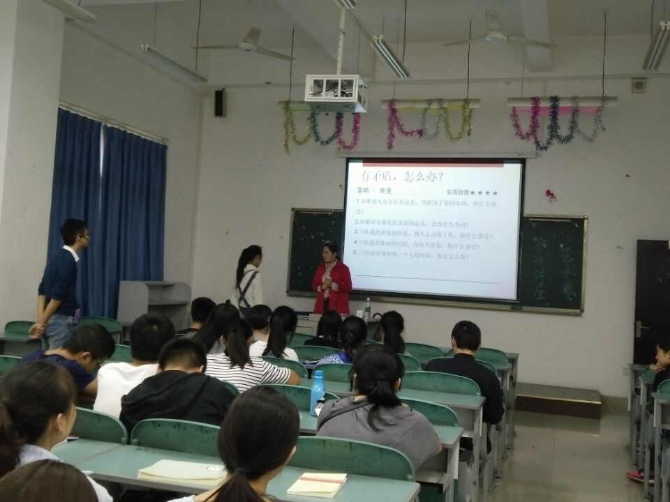28日晚,心理健康中心兼职心理老师、国家三级心理咨询师、院团委书记杨敏老师在机投校区学术报告厅,为经济管理系的同学们开讲。杨老师以大学生寝室案件引导大家对于和室友关系处理的思考,教大家以积极沟通、善于赞扬等小技巧与室友相处。29日,兼职心理老师、国家二级心理咨询师、经济管理系办公室副主任林森老师在西河校区为艺术系的同学们进行了讲座。林老师在讲座中穿插了小测试、小游戏等调动了大家的积极性,通过这些互动让大家体会在寝室中出现矛盾的感受,之后林森老师以“尊重”、“协商”、“合作”、“沟通”为切入点向同学们讲解了寝室关系的处理方式。
