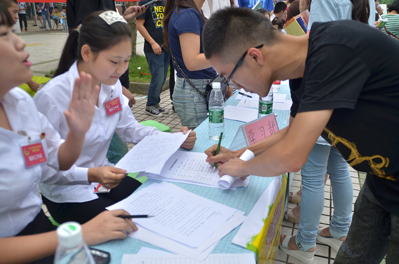 9月3日至4日,我院院团委、院学生会、学生社团联合会、艺术团、青年志愿者总队、宿舍管理委员会在校园内展开了纳新工作。虽然天公不作美,但却丝毫未影响2014级新生对加入到学生自主管理部门的热情。