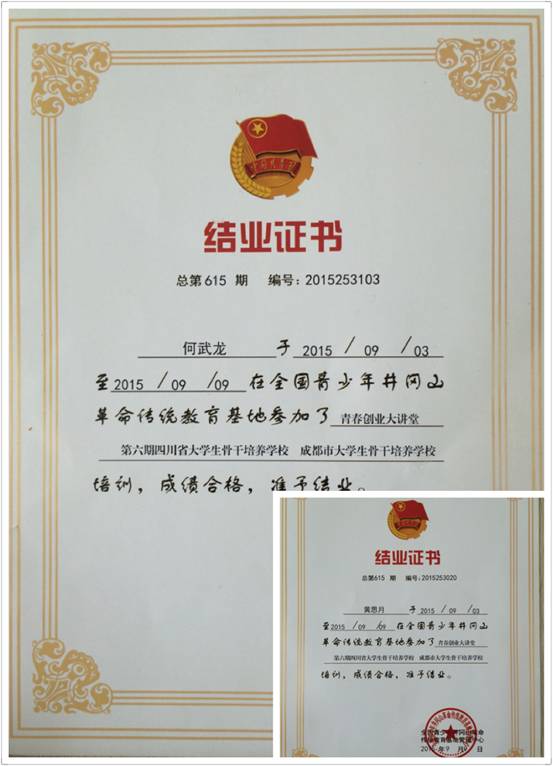 2015年9月,由共青团四川省委、四川省学生联合会主办的“青春大讲堂”第六期四川省大学生骨干培训学校在四川雅安、江西井冈山举行。此次参加培训的是来自全省各高校107名学生代表,而后又新增50名学生代表是来自成都市各大高校。我院学生会主席何武龙、副主席黄思月代表本院参加本次培训。