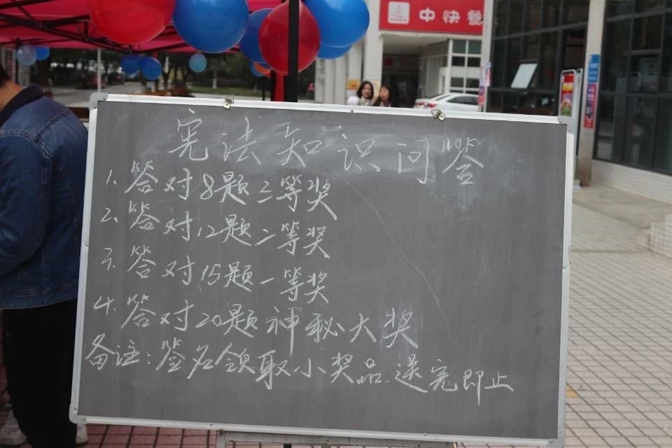 早上9点权益部和学习部的同学在美食广场设点搭建,11点35分正式开始,音响传出宪法宣传广播吸引了很多同学们的围观,他们有的向工作人员了解宪法知识,有的一来就进入活动角色学习宪法知识,有的开始向“度娘”进攻我们的法律灯谜有奖竞猜。此次活动的竞猜奖品丰厚,有抱枕、保温杯、笔记本等。经过一番的脑力竞猜,同学们高兴的抱着奖品,拿着写满宪法的彩色气球离去。“真不错哈,了解了宪法,还能为冬天过冬筹备物资”,熙攘人群中冒出的对话,温暖了这次活动。这不是一次简单的宪法宣传,更是学生会带着自身遵守宪法精神的宣传。