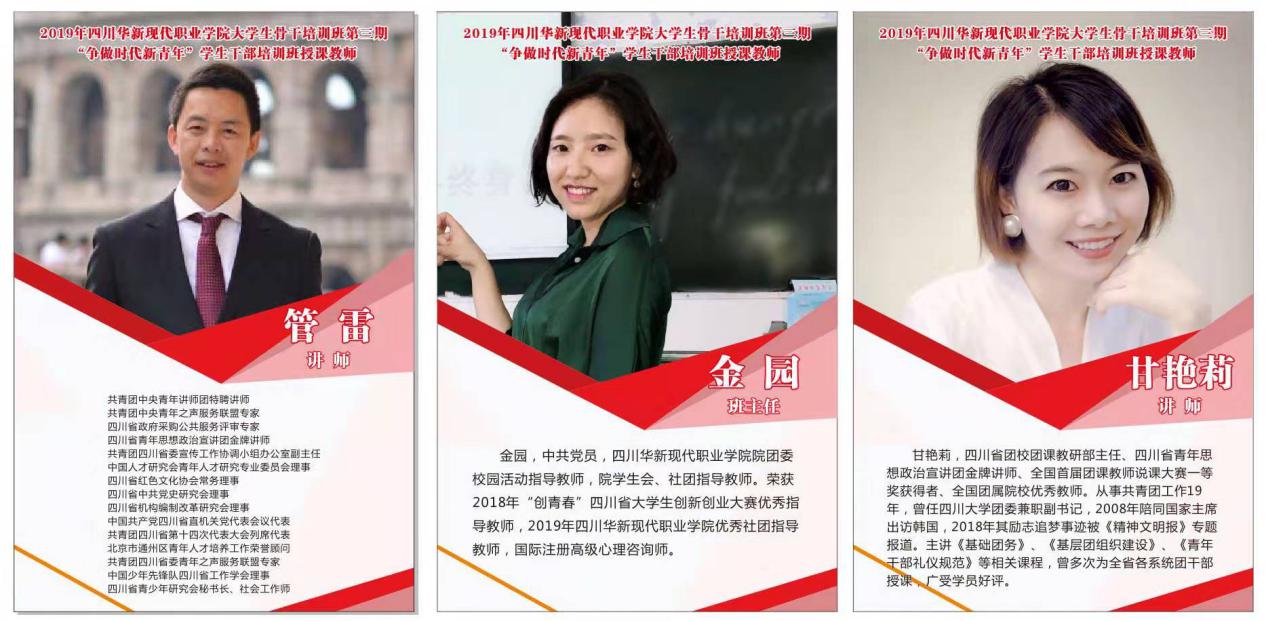 此次骨干班邀请到的授课教师的有:共青团中央青年讲师团特聘讲师管雷、四川省青年思想政治宣讲团金牌讲师甘艳莉、院团委校园活动指导老师教师金园。