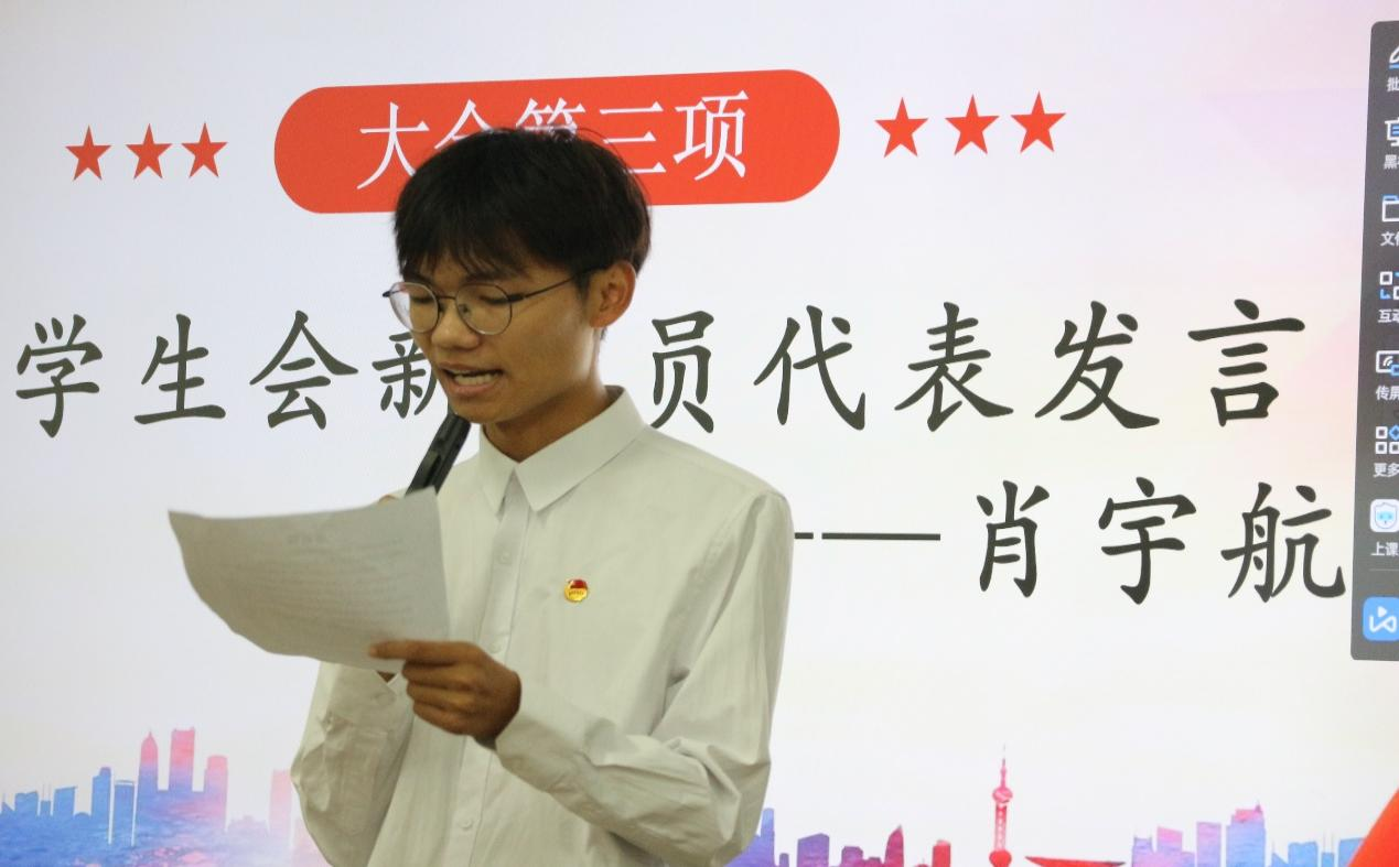新生代表肖宇航在发言中表达了自己对加入这个大家庭的荣幸与自豪。他分享了自己加入学生会后想得到自我发展的愿望,希望和同学们在学生会里共同奋力前行!