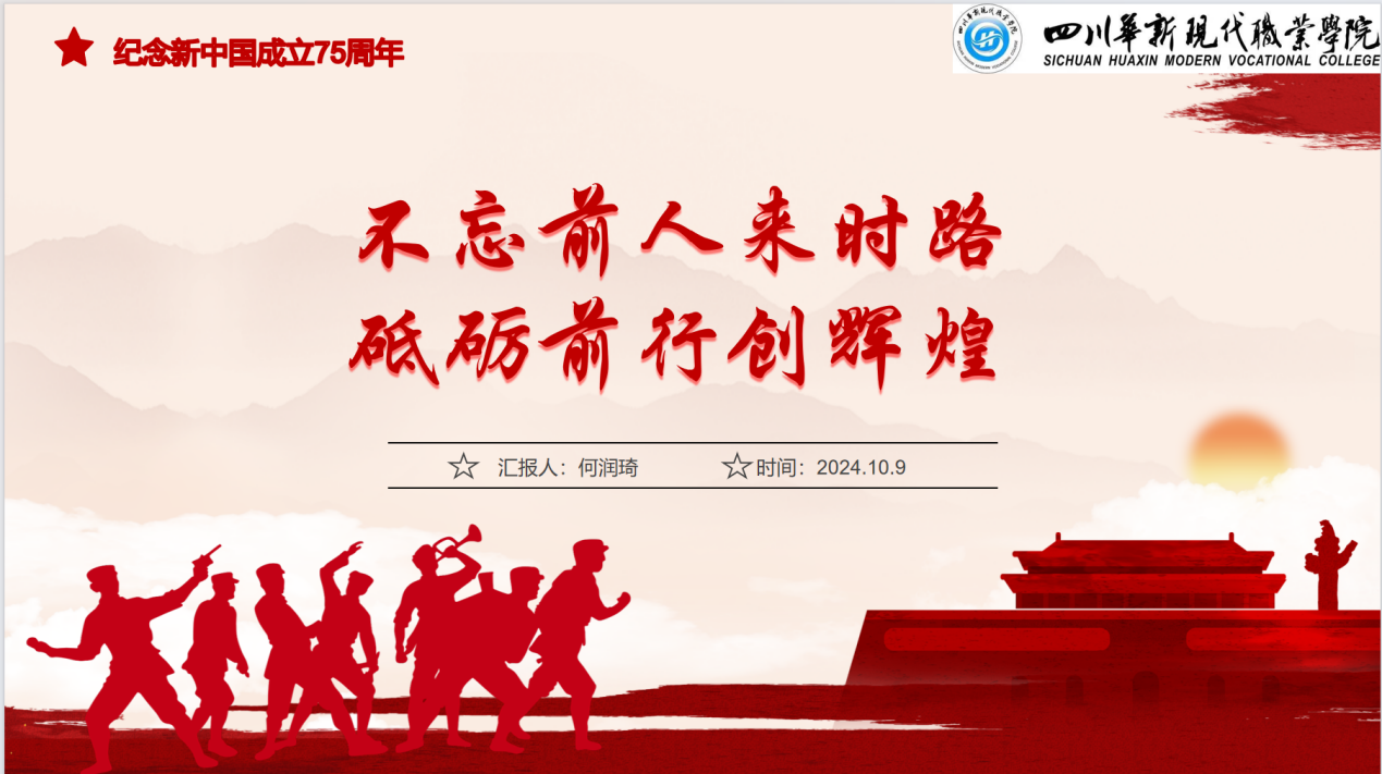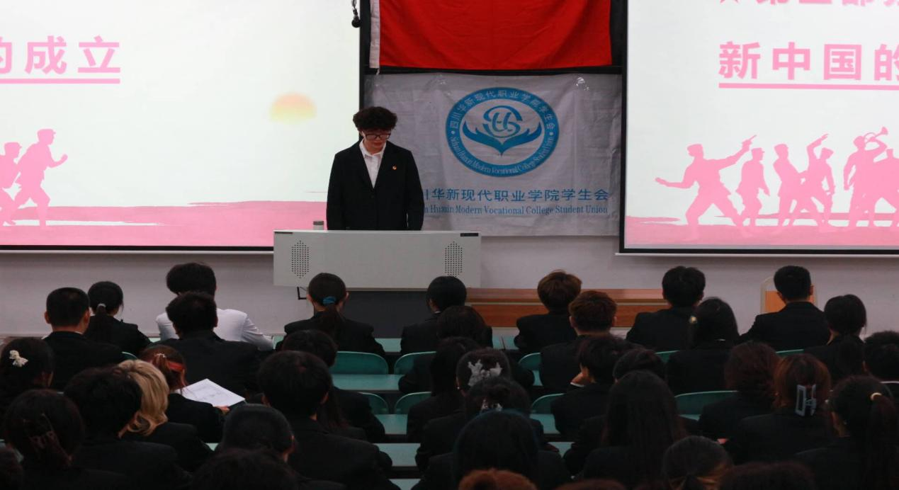 金秋十月,我们迎来了新中国成立75周年的辉煌时刻,在这充满收获与希望的季节,全国上下一片欢腾,共同庆祝这一伟大的节日。校学生会于2024年10月11日下午16:20在博学楼105教室开展第9期“团史青年说”,号召青年学子踔厉奋发向未来。活动由校学生会办公网宣部郭婷婷同学主持,校学生会办公网宣部何润琦同学主讲,校学生会全体成员,以及团委会、新媒体、青协、艺术团、自治委、国旗队和各二级学院学生代表120余人参加。