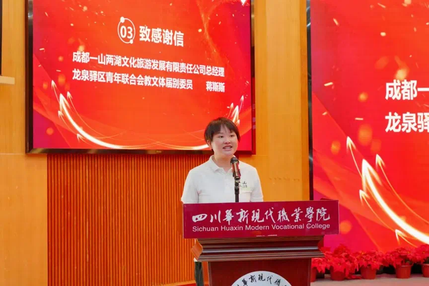 随后,成都一山两湖文化旅游发展有限责任公司总经理、龙泉驿区青年联合会教文体届别委员蒋斯斯致感谢信。信中,蒋斯斯总经理对学院志愿者们在赛事期间展现出的专业素养、奉献精神和高效服务给予高度赞扬,表达了对学院志愿服务团队的由衷感谢,同时也期待未来与学院展开更深度的合作。