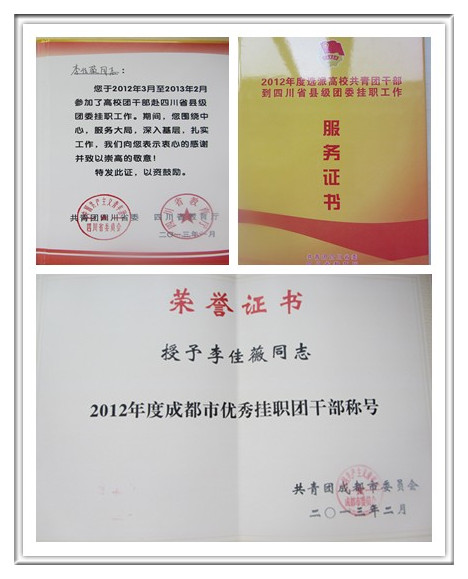 一年来,李佳薇同志与基层干部、青年团员朝夕相处、携手共进,以诚实干练的作风和谦虚谨慎的态度,开拓创新、扎实工作,给予基层大力支持和帮助,也进一步加强了校地联系。李佳薇在浦江挂职期间,展现了当代高校共青团干部求真务实、真情奉献的良好形象,赢得了当地党政和社会各界的广泛赞誉,荣获“2012年度成都市优秀挂职团干部”荣誉称号。