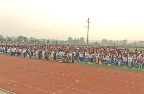 早上8点02分,院领导和师生们早早地来到校园操场参加为悼念“4.20”芦山地震遇难同胞举行默哀仪式。