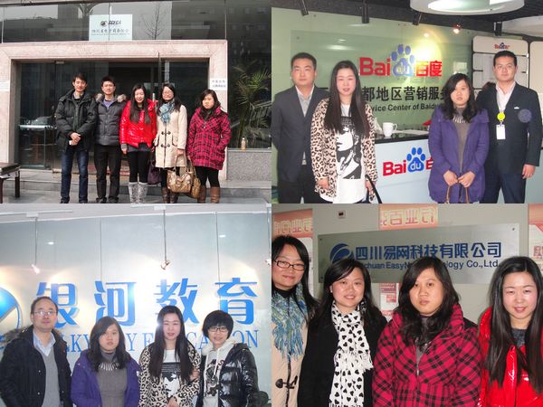 为了更好的培养适应市场发展要求,具有高就业和创业能力的电子商务人才,进一步做好“校企合作”和“产学研结合”的专业建设之路,迎接我院的评估,开学初电子商务专业教师王慧、万静、陈芳走访了四川省易网科技有限公司、四川省电子商务协会、成都银河教育中心、成都百都科技有限公司4家合作企业,与企业老总、专家就我院电子商务专业的建设进行了交流。