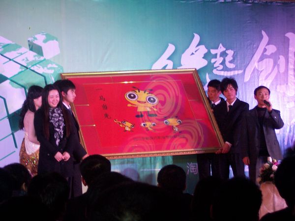 8日晚7点半,“淘宝大学2010年会盛典” 伴随着激昂的鼓声正式拉开帷幕。在合作院校感谢淘宝大学环节期间,我院作为全国高校的唯一代表登台,在我院师生为感谢淘宝大学而精心准备的原创歌曲《明天》渐渐响起的时候,专业老师王慧登上舞台,以展现我院办学成果的系列PPT为背景,详细介绍了同学们原创歌曲和绣原创“淘宝蚂蚁”十字绣的详细过程。随后在追光灯的照射下,刘斌副院长带着珍贵的礼物从会场后面大门走上舞台。十字绣长3米,宽2.5米,大气漂亮,整个会议气氛达到高潮,现场欢呼声不断。