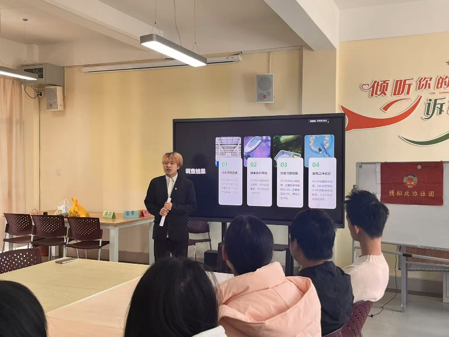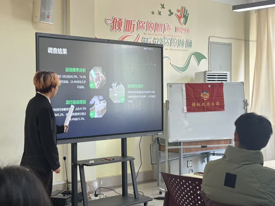为深入了解大学生健康状况,呼吁大家重视运动健康,积极改善生活方式。四川华新现代职业学院模拟政协社团开展了一项关于大学生健康活动调查,并于11月28日中午12点在心理辅导教室进行了汇报总结。本次活动由模拟政协副社长李鑫主持。