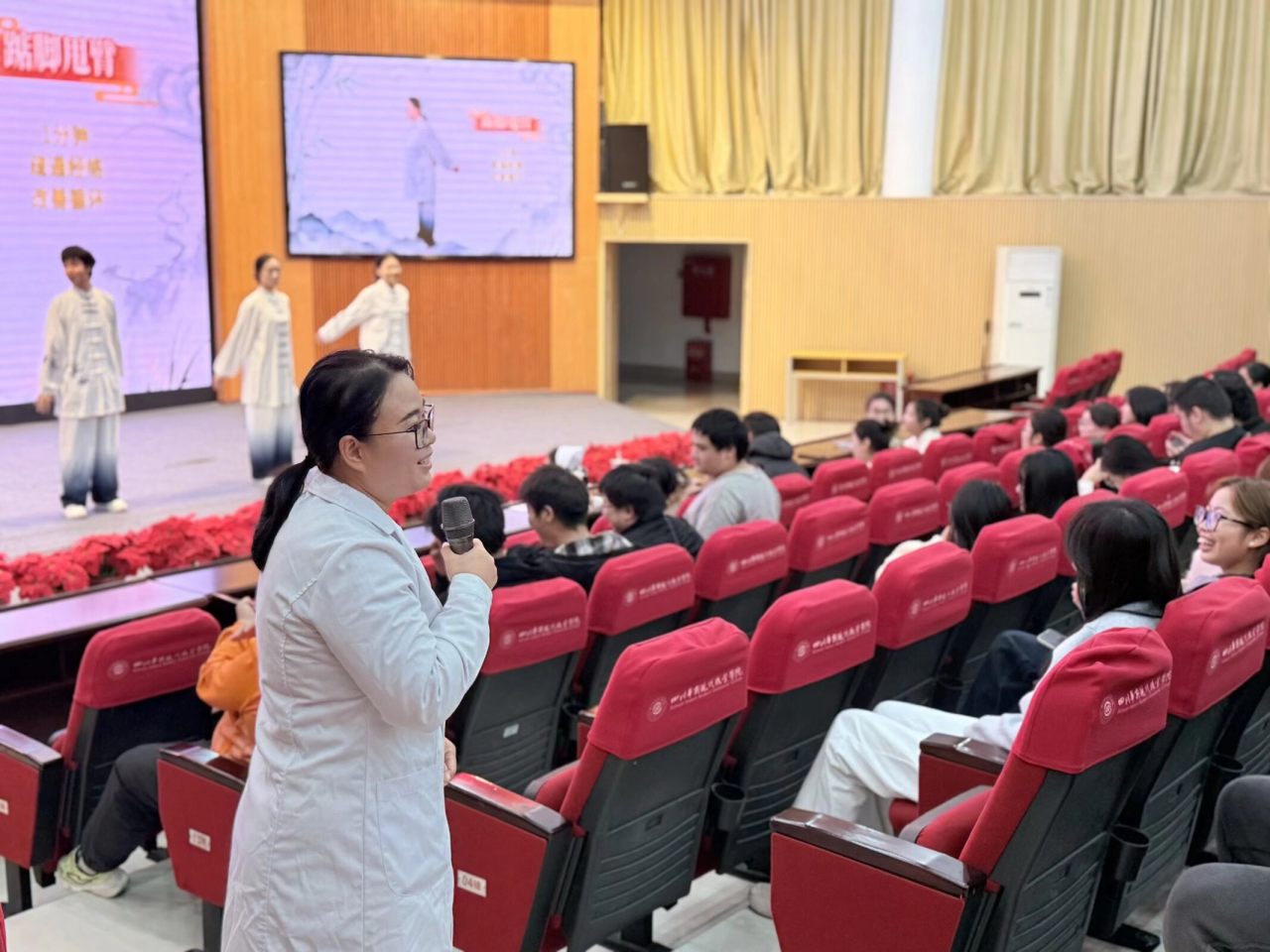 活动伊始,主持人罗琴率先登台,详细介绍了系列讲座的宗旨与五音疗愈的核心价值,为观众铺陈起传统养生的理解之桥。随后,陈皓然等四位社团成员身着统一服装登场,在婉转流畅的江南民乐《紫竹调》中,完整演示了古法宣肺操。队员们动作舒展,以精准的展肩、扩胸与呼吸配合,将中医“调身、调息、调心”的理念融入细微之处,生动诠释了“展肩扩胸宣肺气”的养生原理。现场同学兴致高昂,纷纷跟随模仿,互动氛围热烈非凡。