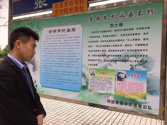 清明节,是我国传统的二十四个节气中最具人文历史的节日,人们在清明怀念逝者、祭祀祖先、缅怀烈士。为培养我院学生爱国主义情操,继承、弘扬中华革命传统美德,2014年4月4日上午9:00,在院团委的组织下,我院学生会、青年志愿者总队集聚成华区院山坡烈士公墓,开展了“缅怀革命先烈、弘扬红色志愿”为主题的清明扫墓活动。活动内容包括:向革命先烈敬献花篮;向革命烈士默哀;缅怀革命烈士的英雄事迹;瞻仰烈士纪念碑;打扫墓园等。其次,我院青年志愿者为缅怀革命先烈,在校园内展出关于纪念革命先烈的红故事图片展板。