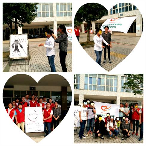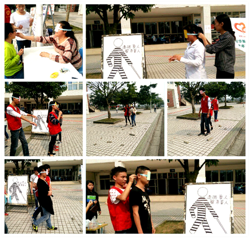 每年的10月15日是国际盲人节。为向大学生人群宣传关爱盲人这一讯息,今年的盲人节主题我们用“体验盲人生活”这一概念为重点。我院20余名青年志愿者作为本次活动的宣传者,与全校师生一起参与了这次活动。