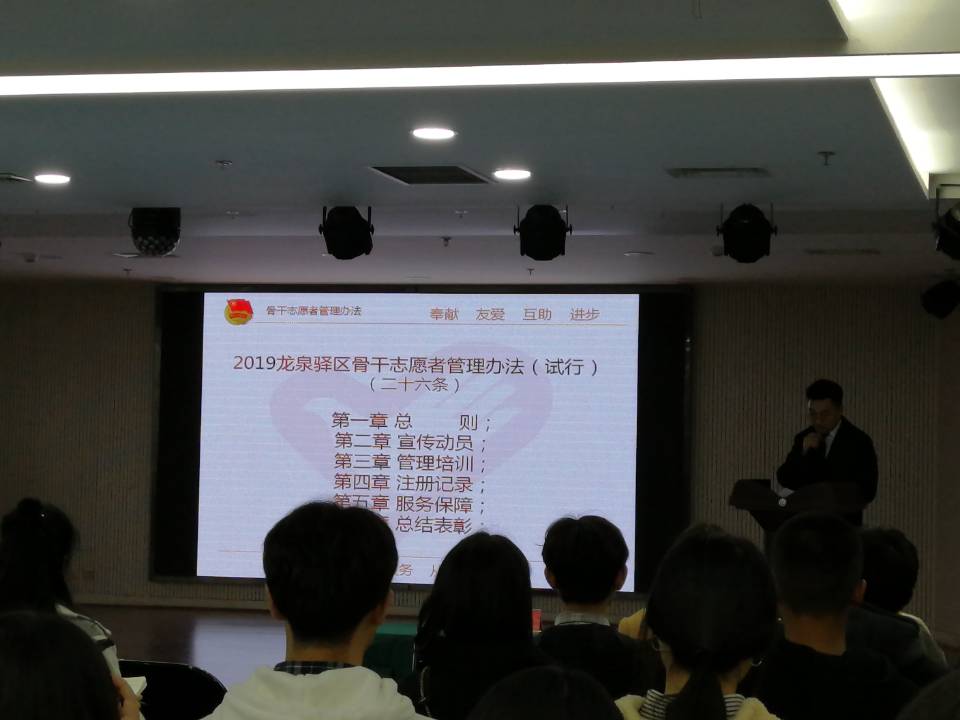 本次驻区高校志愿者见面会暨青年志愿者骨干训练营启动仪式由李新龙老师主持,向我们介绍2019年龙泉驿区骨干志愿者管理办法(试行)包括第一章总则;第二章宣传活动;第三章管理培训;第四章注册记录;第五章服务保障;第六章总结表彰和驻区高校志愿者协会组织架构。