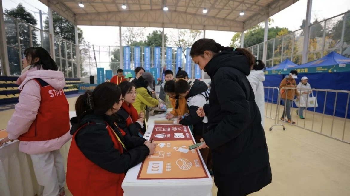 物资补给站的志愿者们摆出“OK”手势,展现积极向上的服务风貌。整齐的物资摆放、醒目的指示标识,背后是他们提前数小时的精心筹备。