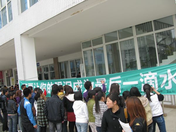 灾情牵动着亿万中国同胞的心,4月1日中午院团委学生会发出倡议,在我院举行了“与环保同行与灾难抗争”活动的启动仪式。此次活动的发起是同学们发自内心的呼吁,希望大家都参与到我们的节能环保中来,不要让我们的眼泪成为世界上最后一滴水。