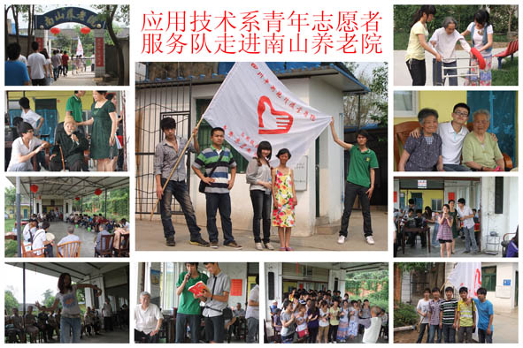 为了发扬“奉献、友爱、互助、进步”的志愿者精神,弘扬社会新风,2011年5月7日,在我系团总支社团部,学生会勤工部的组织下,应用技术系青年志愿服务队走进了南山养老院并开展了一次慰问老年人的志愿服务。生活在这里的大多是60岁以上的老人,他们渴望得到关爱,当我系志愿者服务队顶着烈日来到福利院时,平静的养老院一下热闹起来了,虽然这是我系青年志愿者服务队成立以来第一次外出活动,但同学们一点也不拘束,他们热情地和老人问好,搀扶着他们,询问着老人们的生活起居,身体状况等情况,同时也带来了准备的小节目。他们和老人一起唱歌,一起分享生活的快乐。歌声响起的时候,老人们那开心的笑脸,让同学们心里乐滋滋的。每一位同学都感受到了参与自愿服务,享受快乐的喜悦。当同学们准备离开的时候,他们不舍的表情加上“你们好久又来”“这么快就走啦”等等话语一次次让我们放慢了脚步。人老了需要陪伴,他们的心更需要有我们的青春与活力。