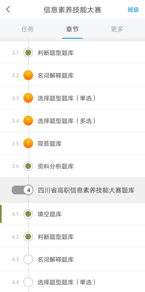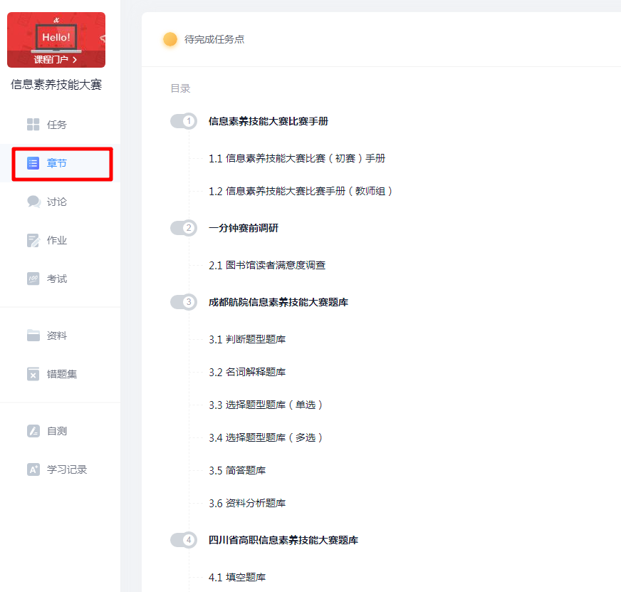 4、 熟悉题库。登录成功后,选择“信息素养技能大赛”课程,点击章节,熟悉参赛题库,进行赛前准备。