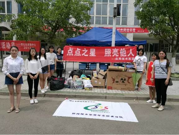 聚为一团火,散为满天星!为了即将毕业离校的学子们对闲置衣物的合理分配与再利用,应用技术系党支部于2017年5月18-19日在校进行了“点点之星,照亮他人”爱心衣物捐赠活动。
