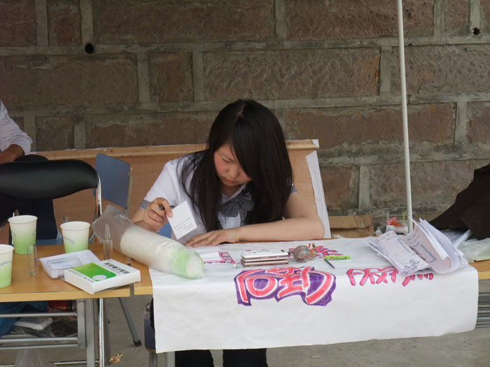 图五:运动会后勤服务站的同学正忙于采写新闻报道稿件