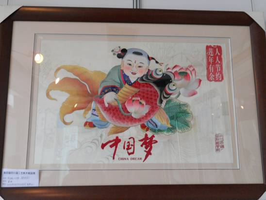 12级蜀绣专业同学严莎、熊嘉雪等同学绣制的《中国梦》在郝淑萍、吴玉英、尹嘉伟等大师的指导下,采用传统技艺,用不同针法精心制作,历时半年完成。该作品是以展现当代中国精神风貌为主题,深受评委的一致好评,荣获金奖。