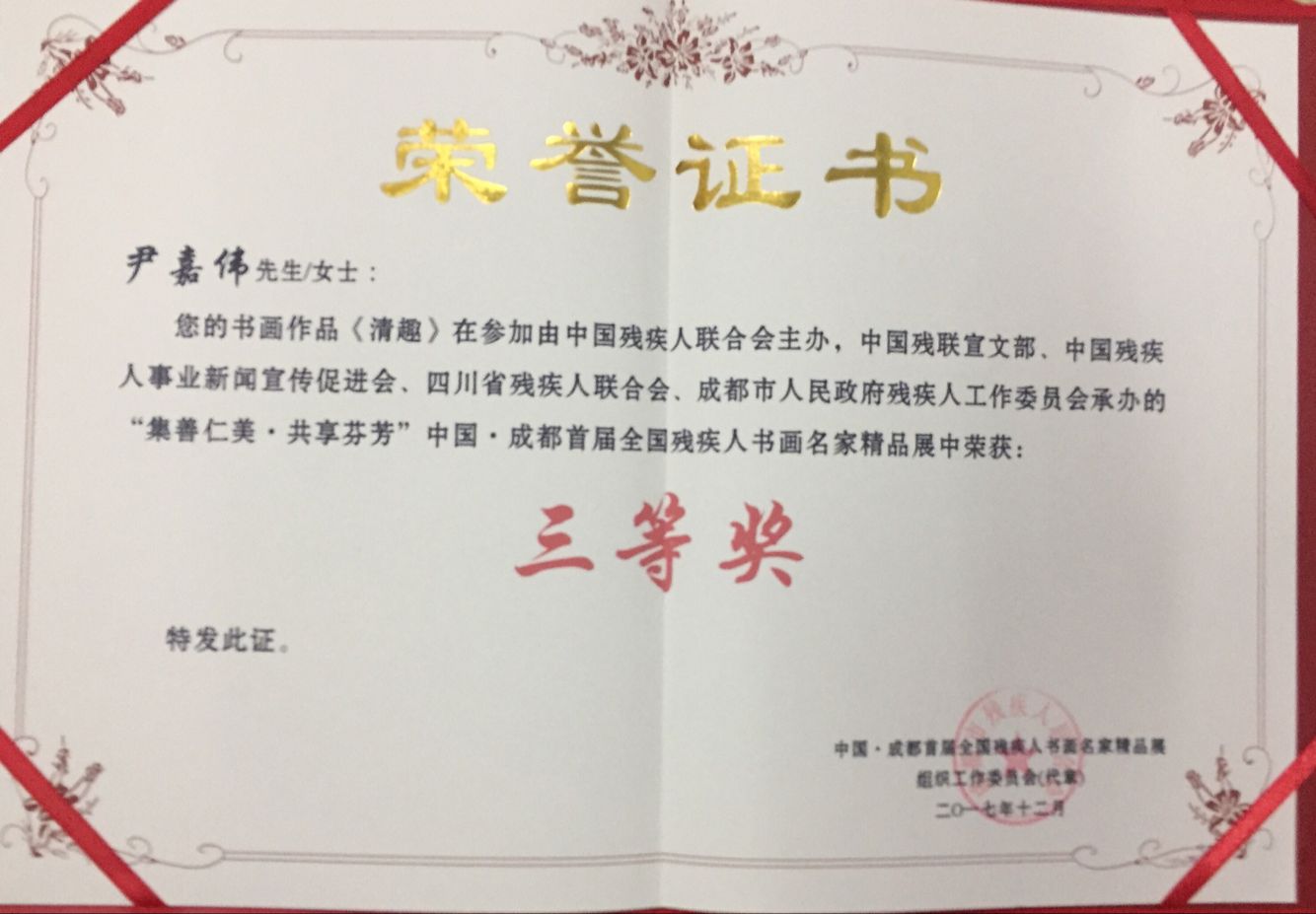 为全面贯彻落实党的十九大和省、市党代会精神,充分展示残疾人事业融合发展的丰硕成果,宣传展示残疾人自尊、自信、自强、自立的精神,为成都市和全国知名残疾人书画家搭建中国传统艺术的学习交流平台,由中国残疾人联合会主办,中国残联宣文部、中国残疾人事业新闻宣传促进会、四川省残疾人联合会、成都市人民政府残疾人工作委员会承办,中国残疾人福利基金会、澳门基金会资助的“集善仁美•共享芬芳”—中国•成都首届全国残疾人书画名家精品展在四川美术馆开幕。应用技术系蜀绣专业教师尹嘉伟的书画作品《清趣》荣获三等奖。
