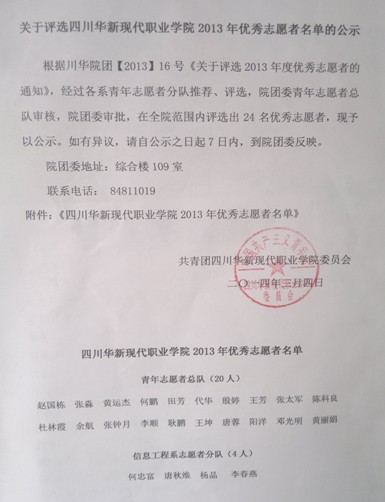我系青年志愿者通过一年的努力,在2013年的志愿服务活动中取得了优异的成绩。我系2012级何忠富、唐秋维与2013级杨晶、李春燕四名同学在本次评选中,通过我系、院团委以及青年志愿者总队的审核,荣获了四川华新现代职业学院2013年度“优秀青年志愿者”的光荣称号。