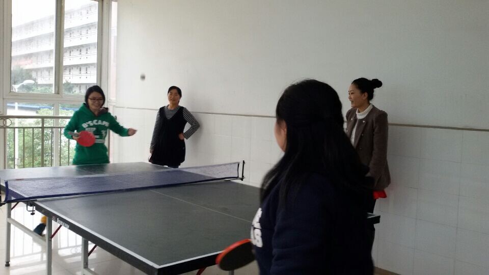 发球、跑动、击打、接球……,两位教师在乒乓球台前尽情挥洒着汗水运动着。其他教师在一旁助威,呐喊,打气。耳边不时传来乒乓球敲击的声音和鞋底摩擦地面的声音。热情的欢笑洋溢在每位教师的脸上。