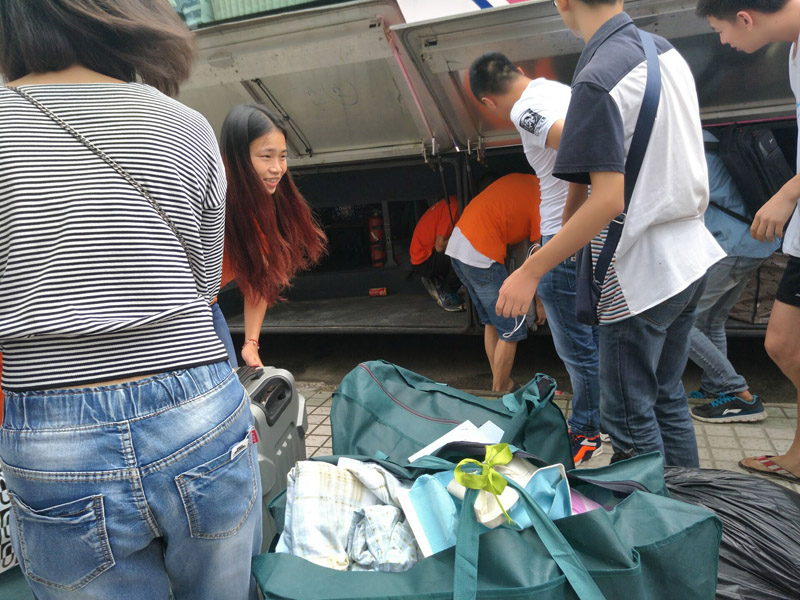 下午两点整,当我系机投校区的同学从16号、17号车缓缓下来时,我系的14名志愿者热情积极的帮助他们拿行李,一路陪伴送至安排好的寝室。