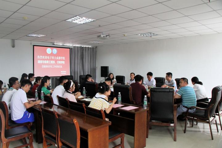 7月6日下午14点30分,电子科技大学成都学院通信与信息工程系、行知学院一行莅临信息工程学院,进行学生工作经验交流分享,分享会在综合楼626会议室召开。参加此次学生工作经验交流分享会的有四川华新现代职业学院副院长刘斌、信息工程学院院长周勇、党支部书记杨敏、信息工程学院副院长邓先春、党支部副书记张启才、信息工程学院互联网学院副院长李姣姣、电子科技大学成都学院通信与信息工程系党总支书记荆竹、行知学院学生工作负责人田强、通讯与信息工程系团委书记郭小川以及双方学院的辅导员。此次学生工作经验交流分享会由信息工程学院党支部书记杨敏主持。