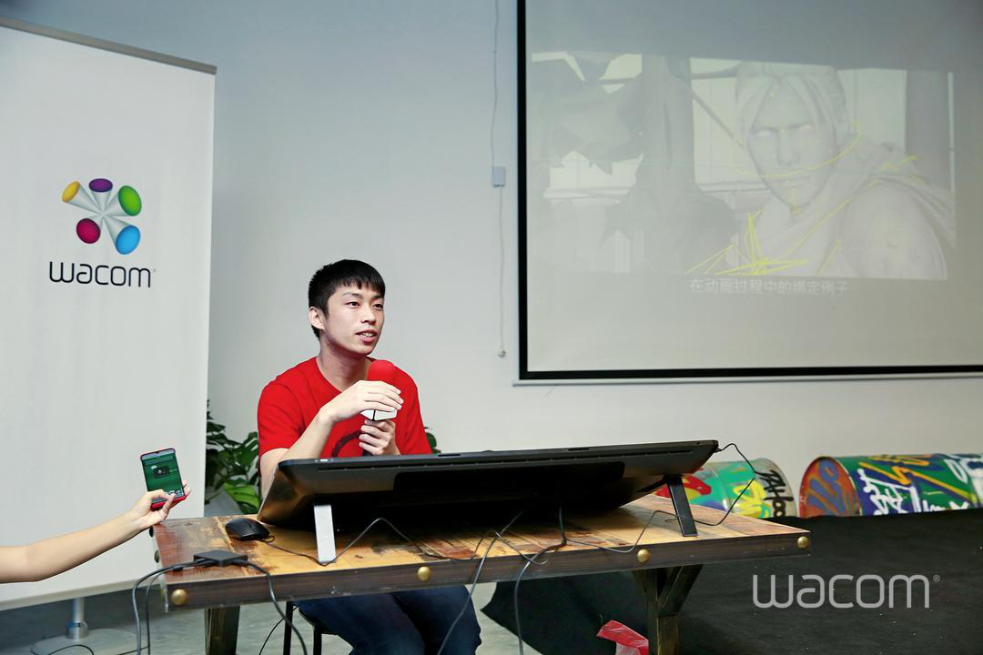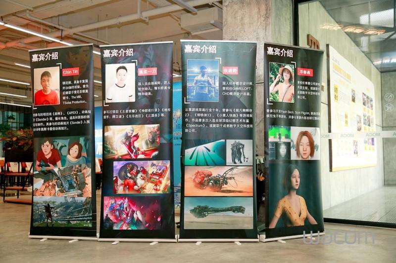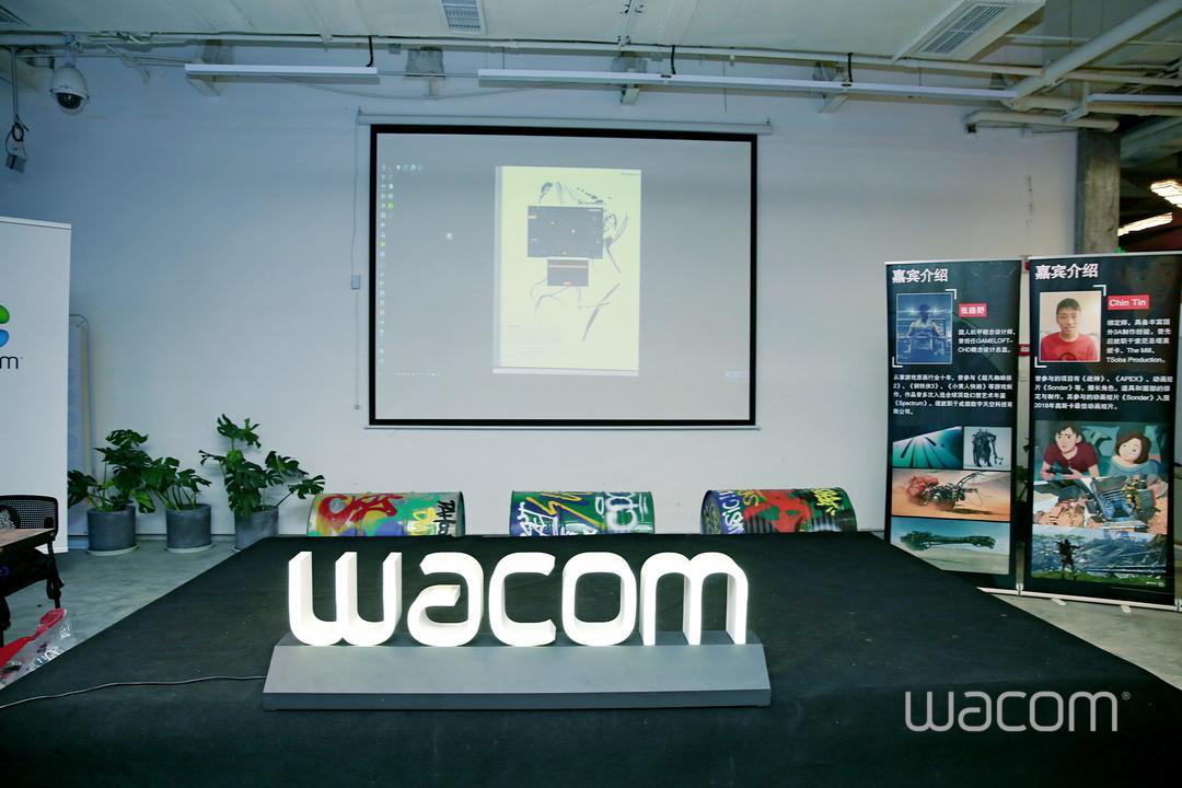 下午一点半开始嘉宾签到,两位老师随着行业内其他高校教师与成都游戏圈的美术同仁一同进入会场,现场展示了多台WACOM公司的数位板数位屏等设备,十分吸引大家的眼球,大家跃跃欲试。