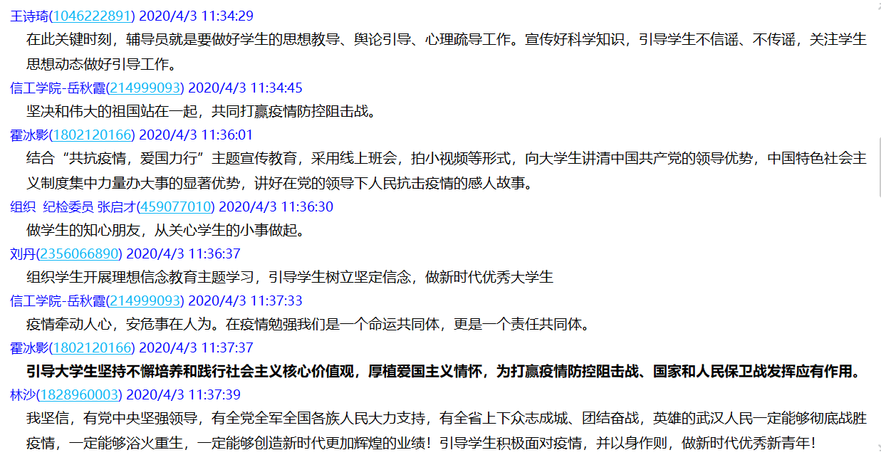 会议强调,要加强爱国主义理论研究,加强爱国主义教育,积极引导学生弘扬和践行爱国主义精神,引导学生做防控疫情的坚定拥护者、停课不停学的坚定落实者,为坚决打赢疫情防控阻击战树立坚定信心,推动《<新时代爱国主义教育实施纲要>的工作方案》贯彻落实、落地,取得实效。在疫情防控的特殊时期,全院要深入学习宣传贯彻落实《新时代爱国主义教育实施纲要》实施方案,坚持爱国和爱党、爱社会主义高度统一,强化师生爱国主义教育和理想信念教育;全体教师要将专业课程与课程育人深度结合,加强价值引领,实现教书育人有机统一;支部工作、学生工作要积极拓展活动载体,开展好党团日活动,引导学生树立正确的世界观、人生观和价值观,做到与祖国一起成才。