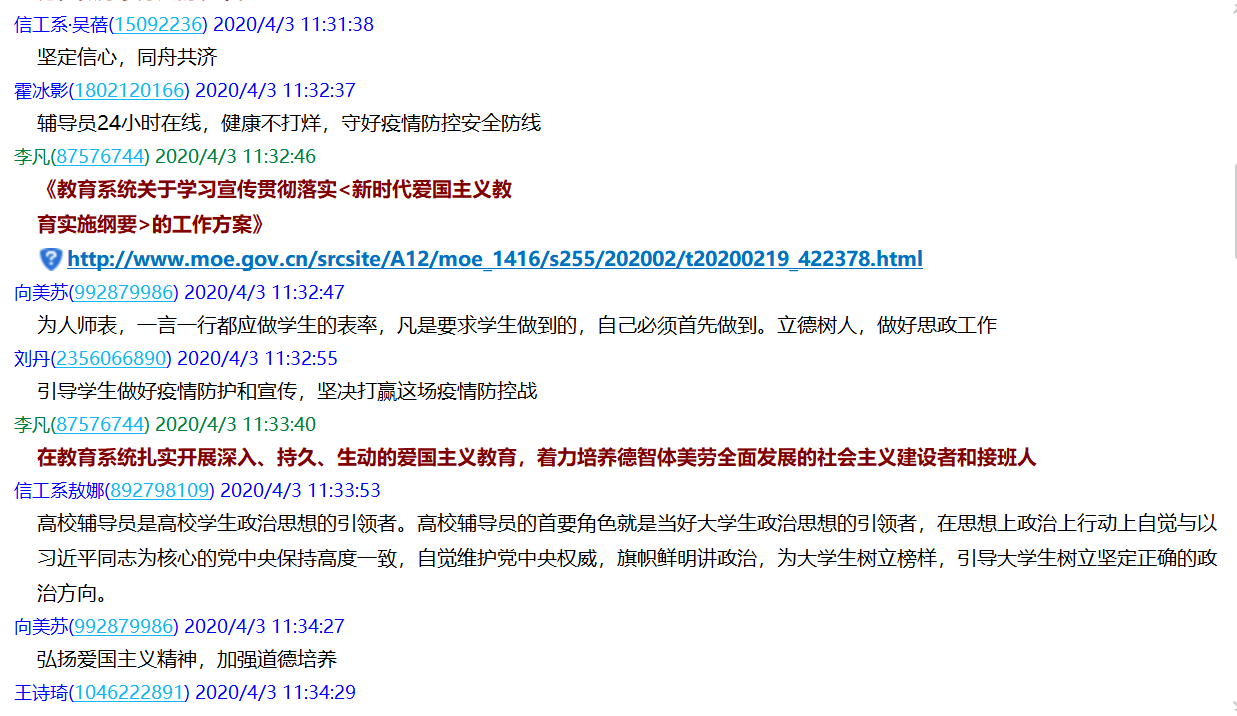 4月3日,信息工程学院学习中共教育部党组印发的《教育系统关于学习宣传贯彻落实<新时代爱国主义教育实施纲要>的工作方案》精神,并部署落实工作。会议由信息工程学院党支部书记李凡同志主持,全体党员在线上参加学习。