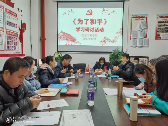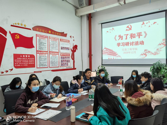 2020年12月18日下午,信息工程学院全体教师再聚明德楼111,开展《为了和平》座谈研讨会。老师们各抒己见,今天的幸福生活是在伟大的中国共产党的坚强领导下,革命先烈用鲜血和生命换来的,一定要大力弘扬伟大的抗美援朝精神,牢牢把握正确的政治方向和舆论导向,统一思想,凝聚共识,奋勇拼搏,攻坚克难,传播社会正能量,为实现中华民族伟大复兴的中国梦作出自己应有的努力和贡献。