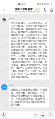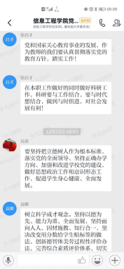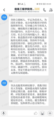 随后,党员教师在学习强国APP强国通讨论组与会同志就如何改进高等学校评价、改革教师评价、改革学生评价、改革用人评价等主题进行了交流发言。 袁娜同志谈到,树立科学成才观念。坚持以德为先、能力为重、全面发展,坚持面向人人、因材施教、知行合一,坚决改变用分数给学生贴标签的做法,创新德智体美劳过程性评价办法,完善综合素质评价体系,切实引导学生坚定理想信念、厚植爱国主义情怀、加强品德修养、增长知识见识、培养奋斗精神、增强综合素质。霍冰影同志谈到,坚持立德树人,牢记为党育人、为国育才使命,充分发挥教育评价的指挥棒作用,引导确立科学的育人目标,确保教育正确发展方向。坚持科学有效,改进结果评价,强化过程评价,探索增值评价,健全综合评价,充分利用信息技术,提高教育评价的科学性、专业性、客观性。坚持统筹兼顾,针对不同主体和不同学段、不同类型教育特点,分类设计、稳步推进,增强改革的系统性、整体性、协同性。