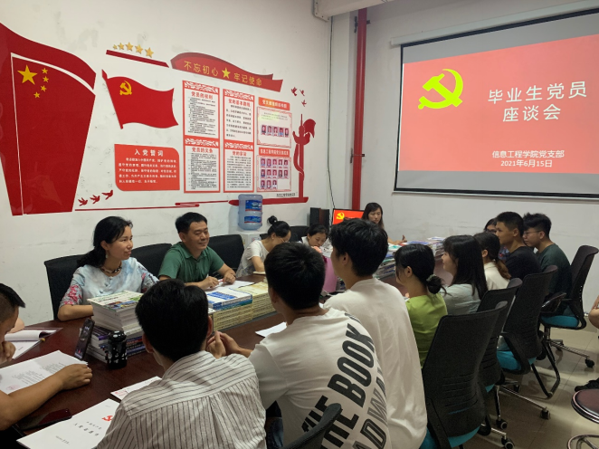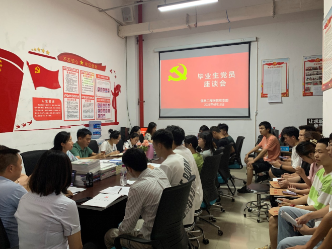 2021年6月15日中午12:30信息工程学院党支部在西河校区明德楼111党员活动中心召开毕业生党员座谈会,信息工程学院副书记张启才同志主持会议,二十余名毕业生党员代表参加。此次座谈会旨在勉励毕业生党员,在踏上新的学习和工作岗位时,能勇于担当党员责任,时刻不忘党员身份。