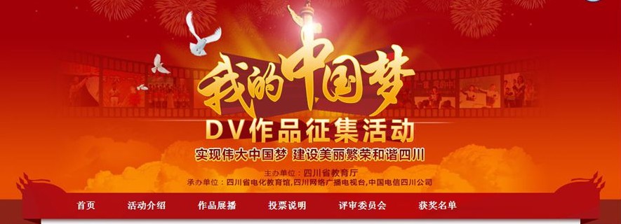“我的中国梦”DV作品征集展播活动由四川省教育厅主办,四川省电化教育馆(四川教育电视台)、四川网络广播电视台、四川省电信有限公司承办,从20136月开始起至10月止,在全省普通高校和中小学征集DV作品300余部。