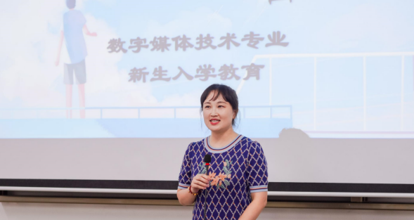 数字媒体技术专业教师袁娜从专业介绍、三年学习的课程介绍、本专业就业方向和就业前景、校企合作协同育人、校内数媒专业实训基地校园电视台等方面为新生们做了详细的专业认知教育。期间袁老师通过案例展示、视频展播等形式让同学们更加直观地认识本专业学习内容及特点。