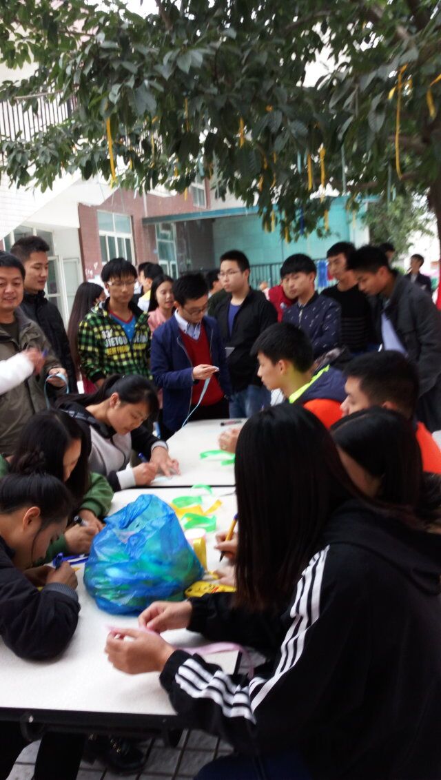 感恩节虽是西方国家的传统节日,但是世界上的每一个人都有着一颗感恩的心。活动分为11点30分至13点和14点10分至18点两个阶段举行。在中午放学后,志愿者们便积极搬运器材在食堂旁边布置好活动场地。在感恩的歌声的伴随下,很快吸引了很多同学来参加活动,写丝带寄语,横幅签名等活动,带动了每位来参加活动的同学那颗感恩的心。最后,此次活动在志愿者们的欢声笑语中于下午六点结束。