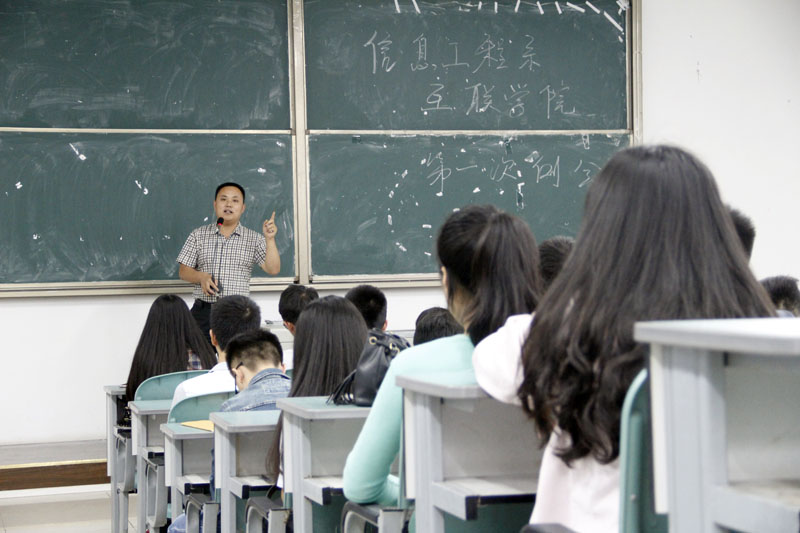 会议开始后,信息工程系团总支书记张启才老师首先上台讲话,他代表信息工程系、互联网学院团总支学生会热烈欢迎新同学们的加入,并对学生会的具体工作进行了简单的介绍并提出了殷切希望。张老师鼓励大家树立正确的立场和动机,多多参与学生会工作,在工作中实现和体现自身价值。张老师提出做事要有团队意识;要有自信心、责任感和亲和力;对待工作和学习要学会思考,做到学习工作共同发展;最后,强调新老干事在感情上多多交流,希望大家认真、负责任、有大结局意识;不要被生活上的情感所困,做一个心理健康,具有思想先进型、创新型的当代大学生。
