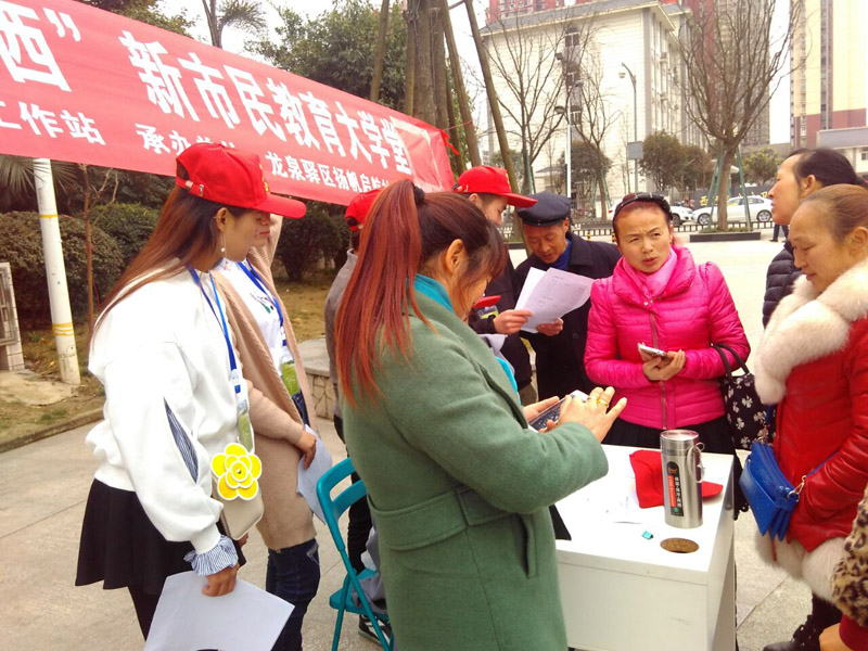 2017年3月14日下午,信息工程系青年志愿者分队联合扬帆起启航社会工作服务中心,在滨西广场进行了“尚学龙泉·幸福滨西”新市民教育大学堂,附近的广大市民参加了此次活动。