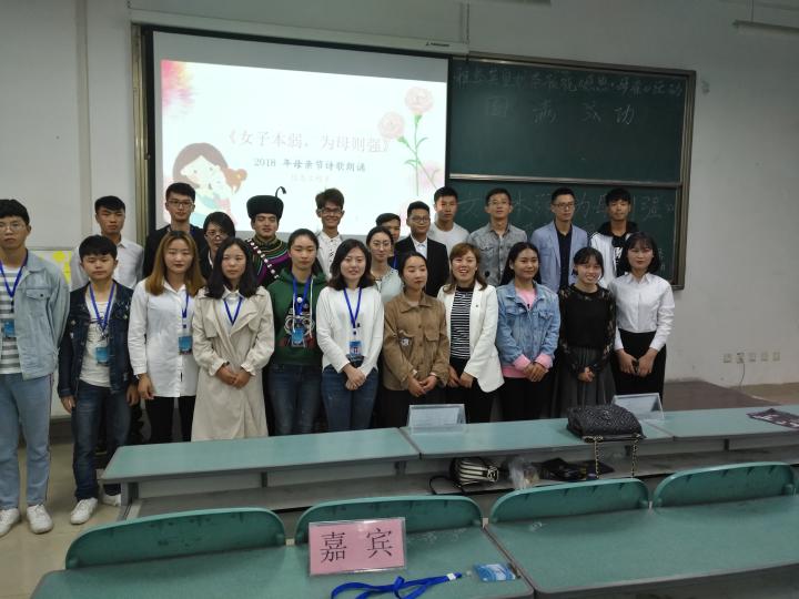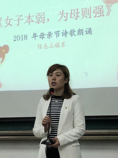 为了丰富校园文化生活,重温成长过程,感恩伟大母爱。让大学生学会感恩,学会用心灵关怀。了解母亲节的来历,知道母爱的伟大;懂得珍惜亲情,丰富学生的情感世界,让学生懂得每个人的成长离不开父母养育之恩、懂得“感恩”。信息工程系2018年5月10日下午17点在教学楼113举行了以“女子本弱、为母则强”的诗歌朗诵比赛,信息工程系党支部书记杨敏,全体学生工作教师以及团总支学生会的全体干部、17级的班级代表参加了本次诗歌朗诵大赛。