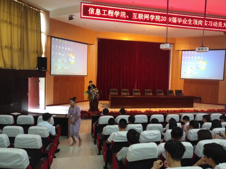 6月8日下午,信息工程学院、互联网学院在学术报告厅召开“顶岗实习动员大会”,旨在使2019届毕业生了解实习注意事项、目前就业形势、顺利完成实习就业、顺利毕业等。信息工程学院、互联网学院全体教职工以及学院招就处的老师,18届优秀毕业生参加了此次动员大会。
