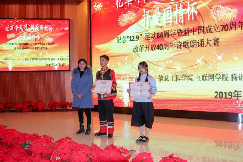 大旗猎猎飘扬、声震云天,信息工程学院纪念一二九运动诗歌朗诵大赛在《青春中国》的朗诵中拉开了序幕。