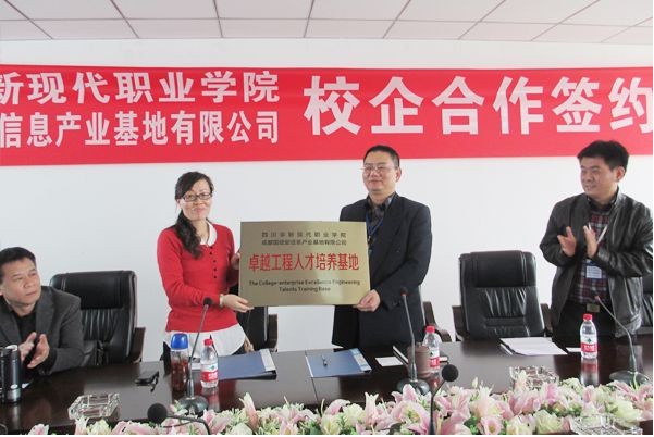 双方代表为“四川华新现代职业学院·国信安校企共建卓越工程人才培养基地”揭牌