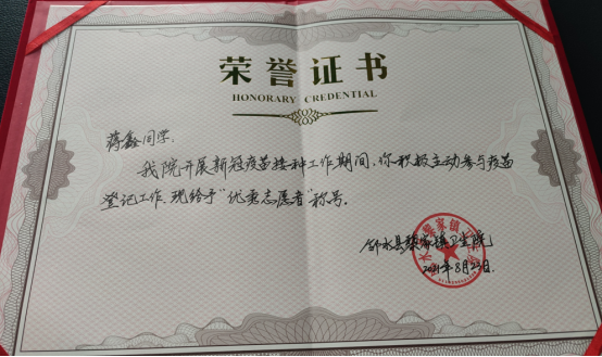 2019级计算机应用5班蒋鑫同学暑假期间在邻水县黎家镇卫生院开展疫苗接种志愿服务,进行疫苗接种宣传指导、免费发放防疫口罩和宣传资料。对已接种的居民跟踪随访他们身体上有无不适,对还没有接种的部分居民让他们及时来院进行疫苗接种,让疫苗接种工作宣传家喻户晓,应接尽接。针对群众关注的疫苗接种人群,注意事项等问题,为群众进行了耐心细致的讲解,特别是有慢性病、行动不便、智障的人群和老年人,耐心讲解接种疫苗的好处,解除他们心存的疫苗接种疑虑,并帮助他们及时解决来院接种疫苗时的实际困难。疫苗接种期间,指导协助群众填写疫苗接种相关信息并引导大家到接种区接种,获得“优秀志愿者”称号。