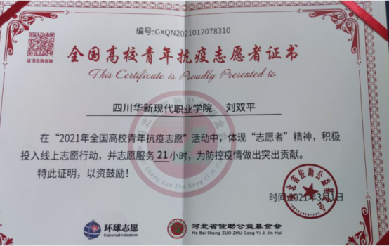 2020级软件技术2班的刘双平同学在疫情期间,认真学习疫情防控相关知识,积极参与国家卫生健康委员会主管的《健康指南》杂志社举办“全国高校抗疫科普知识传播志愿行动”,倡导中国青年大学生,率先提高危机意识、预防意识,积极开展疫情防控、志愿宣传等服务。积极参与线上抗疫和万千学子一起线上传播抗疫科普知识,加强防疫意识,为打好防疫阻击战攻做出自己的贡献。参加全国高校抗击疫情科普知识竞答,以满分100获得荣誉证书。
