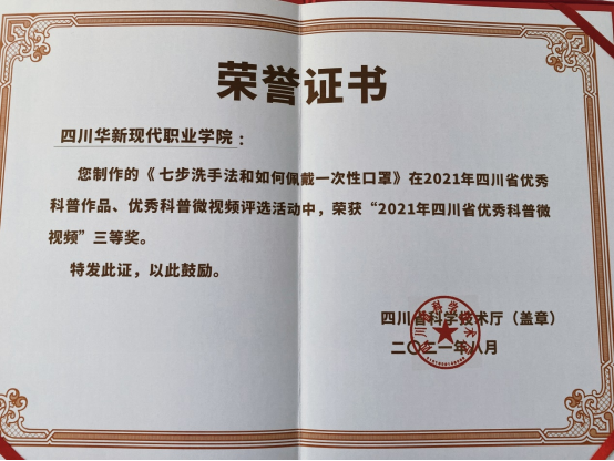 日前,由四川省科学技术厅举行的2021年四川省优秀科普作品、优秀科普微视频评选活动落下帷幕。由学院防疫办、信息工程学院、医护学院联合制作推荐的科普短片《七步洗手法和如何佩戴一次性口罩》荣获三等奖。