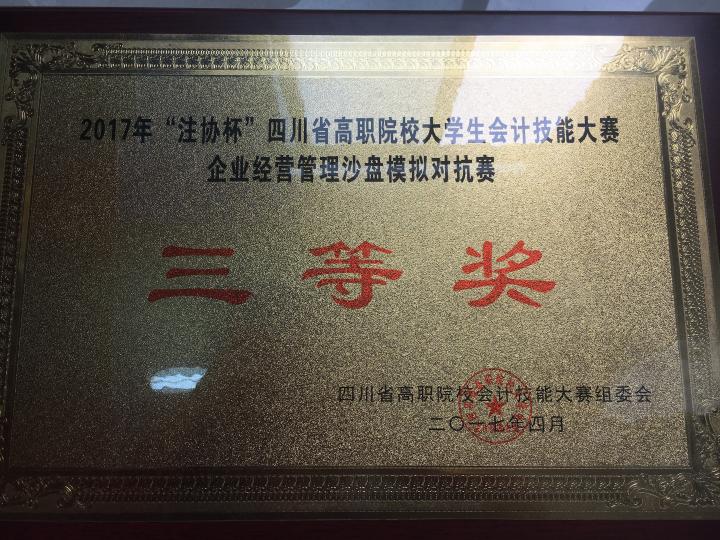 2017年4月8日,在刚刚结束的“2017年“注协杯”四川省高职院校大学上会计技能大赛”上,由我院经管系组队代表学院参赛的高职组会计技能项目沙盘模拟企业经营对抗赛,荣获“三等奖”。