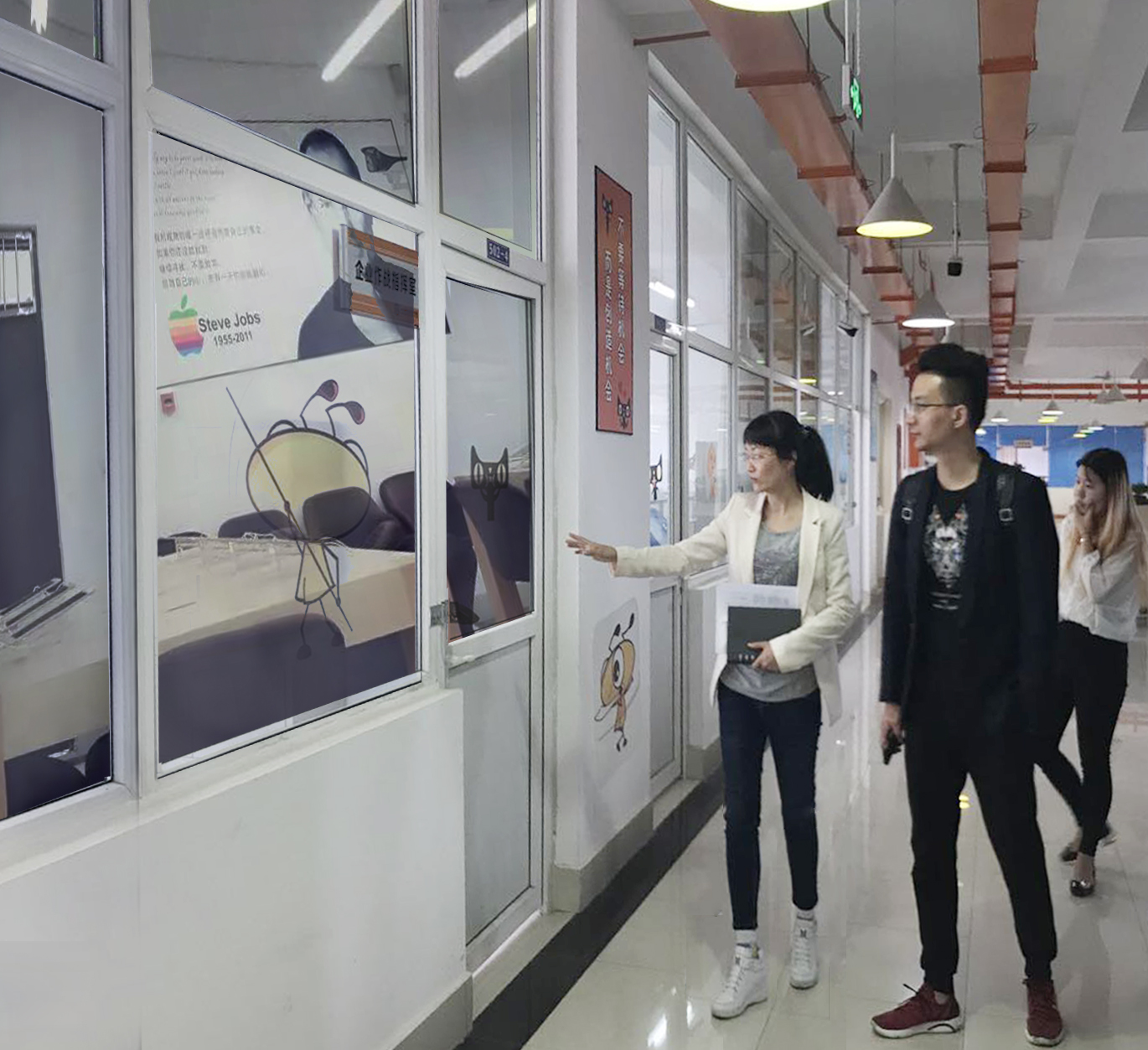 移动商务专业万静老师正在向陈明经理介绍移动电商特色实训室建设情况